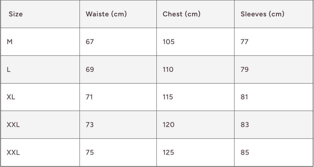 | Size | Waiste (cm) | Chest (cm) | Sleeves (cm) |