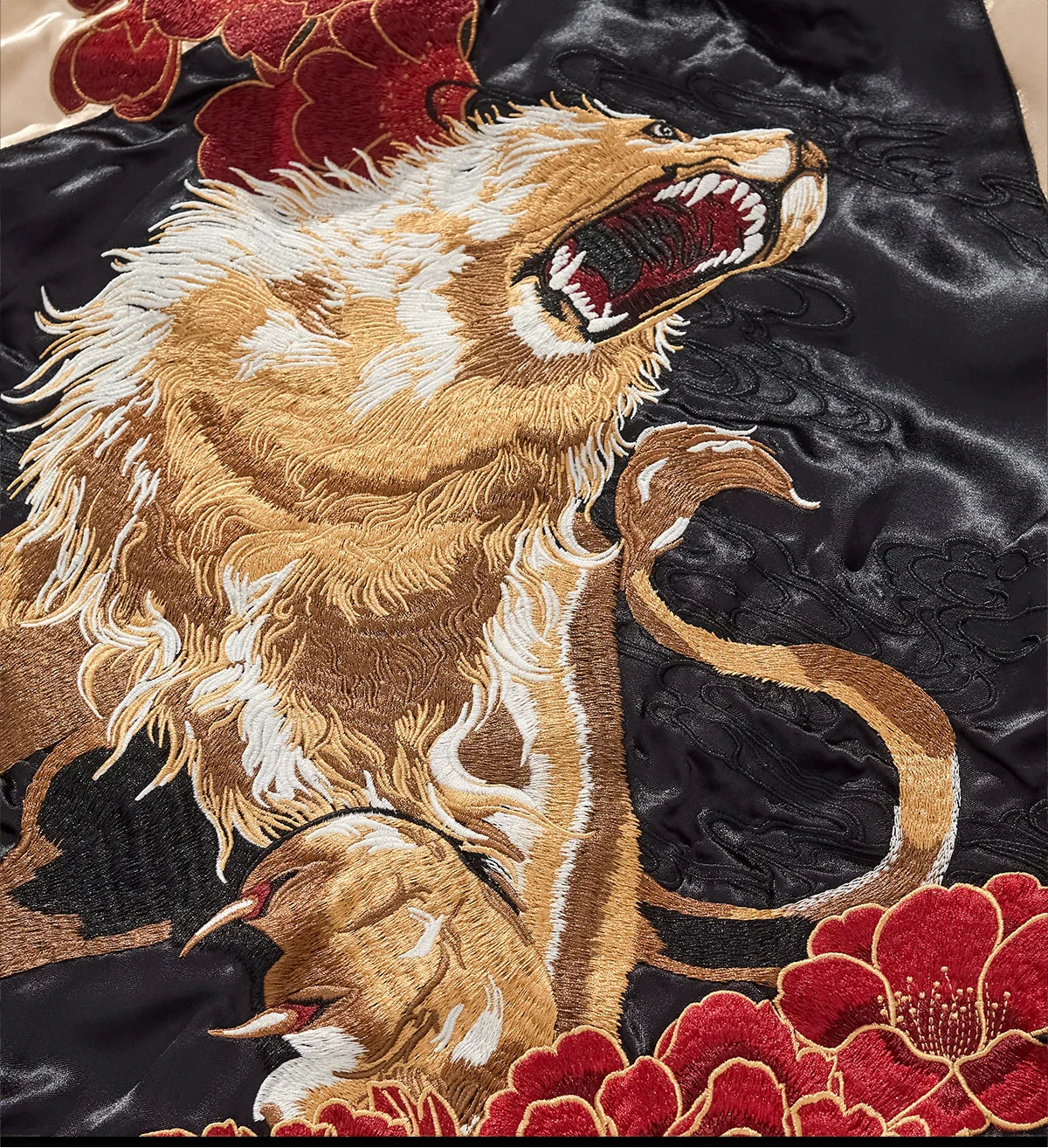 The Hakuba Sukajan captures the fierce spirit of the celestial horse — a symbol of freedom, victory, and unwavering determination in East Asian mythology. Embroidered mid-leap amidst blooming crimson peonies, this design represents motion frozen in time — the unyielding pursuit of success and the elegance of power in motion. The radiant red satin backdrop evokes courage and passion, balanced by contrasting black sleeves adorned with swirling golden clouds.